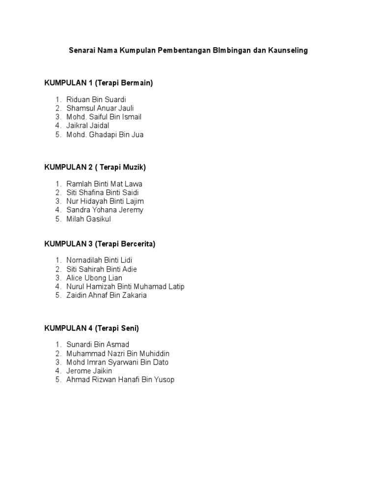 Senarai Nama Kumpulan Pembentangan Bimbingan Dan Kaunseling Pdf