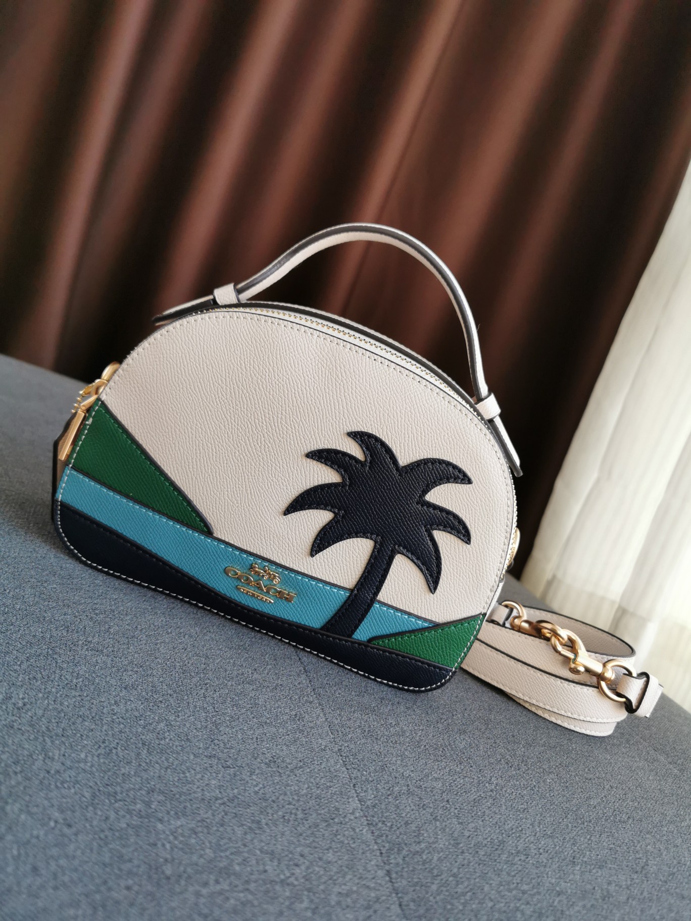 全皮椰子树coach半圆手提斜挎包超可爱 形状是半圆形像个小馒头配色很多老花还是全皮纯色都有双拉链容量ok 肩带长短可以调节哦 尺寸 21 15 6cm 包哥哥